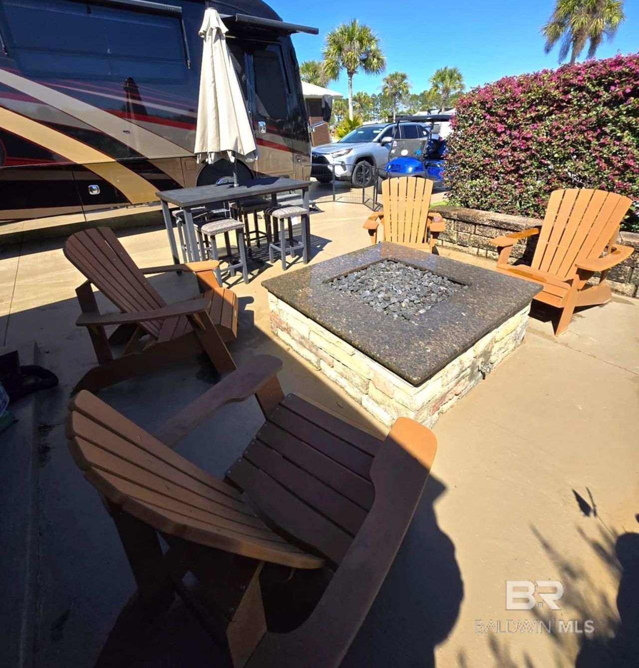 Luxury Class A (15 years or newer & 32' or greater in length) and SUPER C (10 yrs or newer & 32' or greater in length) Motor Coach Resort. This spacious lot is situated on the resort's West terrace offering beautiful sunrise views for the early risers. This site features a 10' x 14' screened gazebo with pull-down shades and a ceiling fan. The extended patio offers outdoor living and entertaining space with a bistro dining table with umbrella and seating for four. The outdoor kitchen is equipped with a sink and Blaze natural gas grill. On cooler evenings, gather with friends on the four poly Adironack chairs around the natural gas stacked...read more